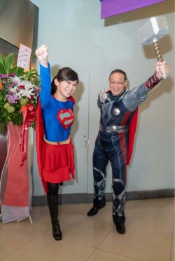 化身為健康女超人的鄭凱云今天帶著兒子出席公益電影活動,基隆長庚醫院院長陳建宗也首度變身雷神,他笑稱自己年紀比雷神大,所以是「雷公」,健康女超人鄭凱云和「雷公」院長林建宗,兩人一起在電影院門口發爆米花、飲料,歡迎家扶中心約150位親子參加活動。