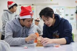 除了用音樂互動,MAI孫麥傑更與憨兒們組隊一起動手製作薑餅屋,從拼裝到裝飾全程耐心陪伴的過程笑聲不斷,孫麥傑更從中感受到與憨兒共處時的暖心問候,「在做薑餅屋的時候,有一位憨兒主動關心我有沒有吃早餐,那個眼神很純粹,也感受到他的溫暖,反倒療癒了我的心靈。」除此之外,熱心做公益的MAI孫麥傑還貼心準備披薩與憨兒們開起美食派對,並穿上基金會推廣的公益年菜 T 與孩子們同樂,原本準備捐出五萬元加菜金的他,在得知基金會同時推動「送愛到偏鄉」關懷物資箱計畫後深受感動,現場還將捐款提高至十萬元,希望在歲末為憨兒與弱勢家庭送上一份實質支持,也盼拋磚引玉,邀請更多人一同響應,為這場溫馨的聖誕活動增添更加暖意及愛心的同時,真善美社會福利基金會更以贈與感謝狀答謝孫麥傑以實際行動為憨兒們帶來溫暖且不一樣的聖誕節,讓愛與幸福在節日中持續傳遞。