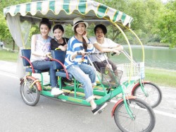 下午大家還去了梅花湖,租了四人腳踏車,剛好三位女藝人都是被喻為最好強的星座–天蠍座,騎車過程中林逸欣還發號司令要騎的像趕通告般,一路狂踩遇到其他腳踏車,管罄還說借過不好意思,我們趕通告,轉彎時陳如山還像騎機車般壓車,過程中騎腳踏車像是跨年趕通告般緊張又刺激。但遇到景點處大家還不忘拍照留念 ,林逸欣還下了拍照動作的指令,規定大家要擺芭蕾動作,大家看照片還不忘虧陳如山果然是搖滾魂,做芭蕾動作手還不忘比ROCK。