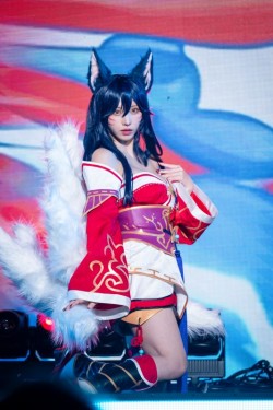 堅持任何工作的妝髮造型都要自己來的Enako,以「英雄聯盟」冠軍角色Ahri(阿璃)的角色現身,一出場先以中文打招呼:「「你好,我是Enako,請多多指教。」她特別介紹今天造型的重點:「就是後面毛茸茸的尾巴,直到上台前都還在梳理調整。」