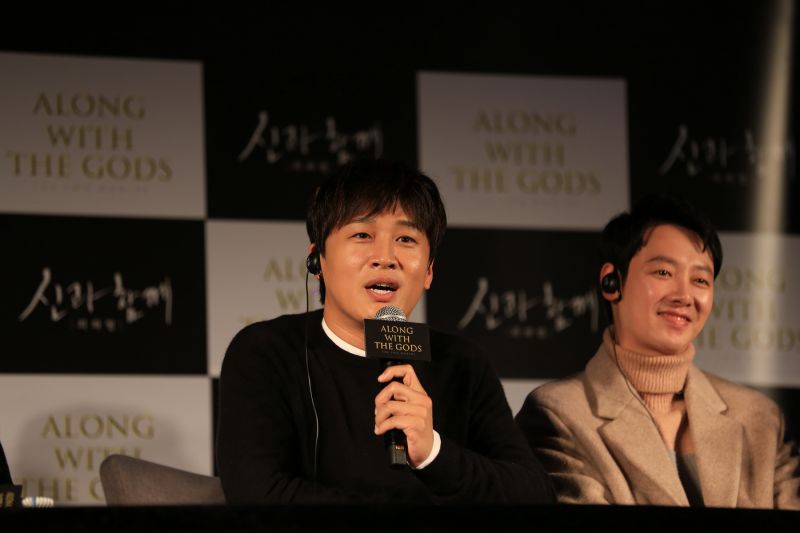 劇情感動讓人又笑又淚,特效精緻媲美好萊塢大片的南韓年度話題強片《與神同行》,18日在南韓首爾舉辦國際記者會與紅毯首映會。記者會上,河正宇透露自己面對壓力時的解決方式是:「吃東西!」朱智勳也馬上在一旁補充:「章魚!栗子!」讓全場媒體莞爾。當問到自己覺得有沒辦法通過的七大審判時,眾演員更是一致謙虛,表示自己恐怕連第一關都過不了,只有河正宇不改搞笑本色說:「我是個演員,應該多少可以用演技來騙過這一關吧。」至於晚間的首映會,更出動全片14位演員群首度共同亮相,眾人排排站場面十分壯觀。而當人氣超旺的EXO成員都敬秀(D.O.)一現身,粉絲的尖叫聲更是要掀破屋頂。不過當他被問到片中七個地獄,有沒有哪一個有信心能夠通過時,只見他說:「應該都無法通過。」憨直發言更是讓粉絲再度尖叫。《與神同行》即將在本週五(12/22)於全台盛大上映。