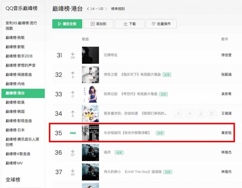 余光中致敬詩歌《與永恆拔河》於一月初做全球數位發行後,首週衝入QQ音樂巔峰榜港台榜,於當前最受歡迎100首歌曲中名列第35名。