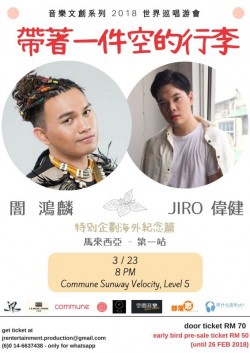 續之前引進大馬的香港唱作人獲得熱烈反應之後,這次演出項目非常特別。制作人 JIRO 偉健專程遠赴臺灣有“來自山上好聲音”之稱的原住民歌手闇鴻麟,為這次演出跨國性合作。音樂會起名為「帶著一件空的行李」,目的是想要大家可以全面性松懈的狀態,擺脫外來的束縛 以最純樸的聲音讓現場的朋友們可以感受並獲得正面能量。