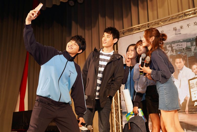 TVBS《翻牆的記憶》演員與育達高職同學開心自拍-(左起)張庭瑚、徐鈞浩、林芯蕾、胡蓓筠