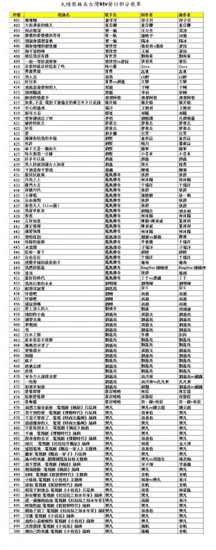 大陸歌曲在台灣KTV發行部分歌單