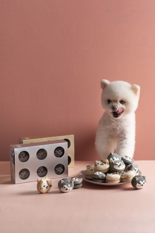 這次DAZZLING貓狗馬卡龍造型禮盒由Dazzling Café製作美味又可愛的馬卡龍,將馬卡龍外型幻化為哈士奇、橘斑貓模樣,工法細緻,連腮紅、鬍鬚等細節都精巧設計,相當生動!禮盒設計則由金曲設計師顏伯駿操刀,外盒運用哈士奇、橘斑貓色澤以燙金、燙銀方式呈現,盒內的腳印及貓掌巧思設計,能感受如同被毛小孩圍繞的萬分暖意。