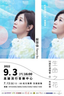 蘇慧倫「生命之花」30週年演唱會再次盛開,前進南台灣全新流行表演大型場域-高雄流行音樂中心,她希望能和歌迷留下更多美好的記憶。「生命之花」演唱會因場次異動,已購票的觀眾,可持原票券依照新的演出時間按原序號/座位入場,還沒購票的觀眾,門票將於7月15日中午12:00拓元售票系統重新啟售 (https://tixcraft.com/activity/detail/21_TarcySu)。