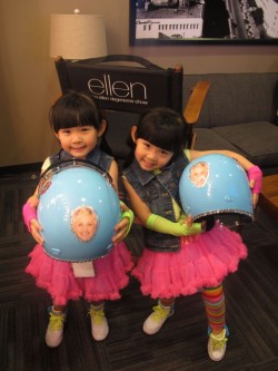 而《艾倫秀》從前一天彩排就對左左右右很貼心,因彩排(5月6日)剛好是左右的6歲生日,製作單位在她們一進棚就送上知名杯子蛋糕祝她們生日快樂,讓她們超開心,反覆彩排多次都沒有喊累,心情很好,只可惜沒有見到主持人。而今天正式錄影,左左右右早早到場準備,有Melody當貼身翻譯老師,兩人不擔心沒練好abc,手牽手上場,終於見到艾倫狄珍妮本尊,左左右右立刻飛撲送上擁抱,對於艾倫的藍眼睛充滿好奇,一直說:「好漂亮!」艾倫親切的問兩人長途飛行累不累?左右說:「好像坐雲宵飛車,很好玩,不會累。」艾倫也好奇怎麼分左左右右?左右這時用上練好的英文,左左說:「I am beautiful!」右右說:「I am cute!」逗得全場大樂,左右也表示練舞是從3歲開始,看著爸爸的平板電腦上偶像們的舞步自學而成。簡單訪問後,左左右右戴上安全帽開始大跳〈Bar Bar Bar〉,萌翻天的表演,贏得全場歡呼。