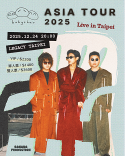 由 Banana Production 和 寶林萊捷喬 聯合主辦,babychair 將於 2025 年 12 月 24 日 在 Legacy Taipei 舉行專場演出,門票將於 2025 年 10 月 15 日 中午12:00 於 KKTIX 正式開賣,更多詳情請持續關注 babychair & Banana Production 的官方社群頁面。