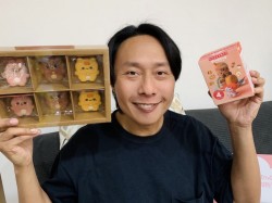 看到啟樂準備的彌月禮盒很可愛,啟樂就說很感謝這個也是從香港來到台灣的Din Dong貓為他特製這個彌月禮盒,而且市面上並沒有販售。禮盒內除了有可愛到捨不得吃的造型餅乾之外,每份彌月禮盒都附有盲盒。啟樂說近年盲盒非常盛行,所以就把這個大受歡迎的概念放進彌月禮盒中,相信這個也是全台灣第一個附有盲盒的彌月禮盒。盲盒內都會有一個以台灣夜市美食造型的Din Dong貓布偶,一共有四款,每一款都有濃濃的台灣特色,而且這個ip是來自香港,就好像啟樂跟他台灣太太所生的台港女兒一樣。