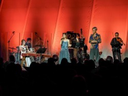 演唱會來到了另一個高潮,當代傳奇劇場花旦黃若琳以絕美的花旦扮相,從觀眾席後方翩然出場,引起觀眾的驚呼讚嘆,她與范怡文一同詮釋京劇版《女人花》,古箏清亮悠遠的琴音率先流瀉而出,鑼鼓、金胡、鋼琴、提琴層層交織,在旋律與節奏之間來回呼應,勾勒出中西音樂的交流,黃若琳細膩而充滿張力的聲音,與范怡文渾厚嗓音完美融合,不禁令人讚嘆。