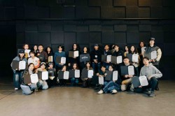 演唱會學院80名學員與金曲歌手呂士軒、王彙筑和北流董事長黃韻玲、執行長梁序倫等全體大合照。