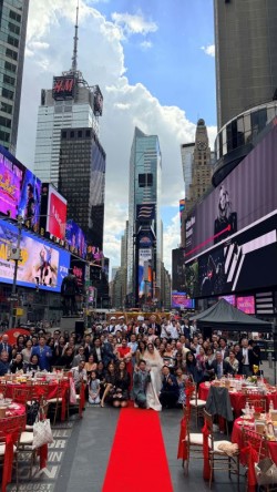繼熊本站掀起話題後,節目日前更前進紐約時報廣場,創下台灣實境節目首度在時報廣場擺桌拍攝的紀錄,光是消息曝光就引爆關注。喜氣十足的辦桌陣仗一字排開,紅通通的台味場景直接在紐約街頭「炸開」,吸引大量當地民眾駐足圍觀,甚至不少人拿起手機狂拍,現場宛如大型文化快閃,話題直接燒起來。台北紐約經濟文化辦事處處長佩服此次的創舉,團隊能克服萬難將台灣辦桌文化在地標時報廣場完美呈現,101董事長賈永婕特別派出美麗女兒情義相挺擔任辦桌日接待。