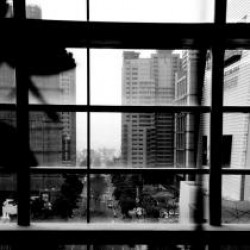 在面前是拉直交錯,掛著嫩綠枝葉盆栽的鐵 絲網。從那鐵線畫出來的小小長方形框框裡,我看到更深處的大塊玻璃架設在合金窗框上。潔淨的窗外是筆直的柏 油路,被夾在兩旁大樓之間。被侷限視野通到遠方的綠色山丘和它之上的天空。視界很遠,心更遠,但是軀體卻被三重禁制著。而軀體下的靈魂更多了一層包膜的束縛。